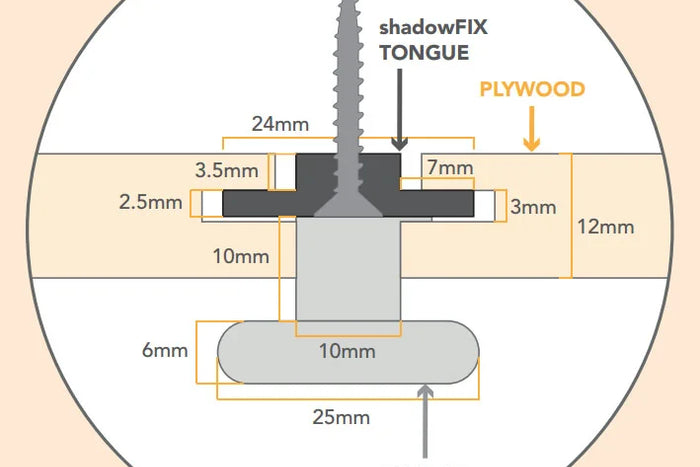 ShadowFIX is a concealed fixing system for plywood panels utilising a patented plastic tongue design, countersunk screws and Tec7 X-Tack adhesive. shadowFIX is easy to install, has no face fixings and creates a perfect 10mm shadow line.