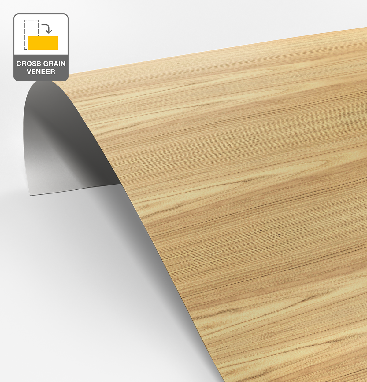 Grain Orientation: Cross Grain - Veneer is applied with the grain running horizontally (cross grain) across the width of the sheet. This configuration is ideal for drawer fronts, overhead cabinetry, and short-span applications like drawer fronts or overheads.