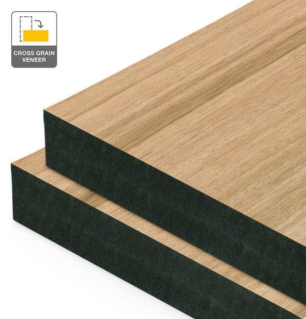 Grain Orientation: Cross Grain - Veneer is applied with the grain running horizontally across the width of the sheet. This configuration is ideal for drawer fronts, overhead cabinetry, and short-span applications.