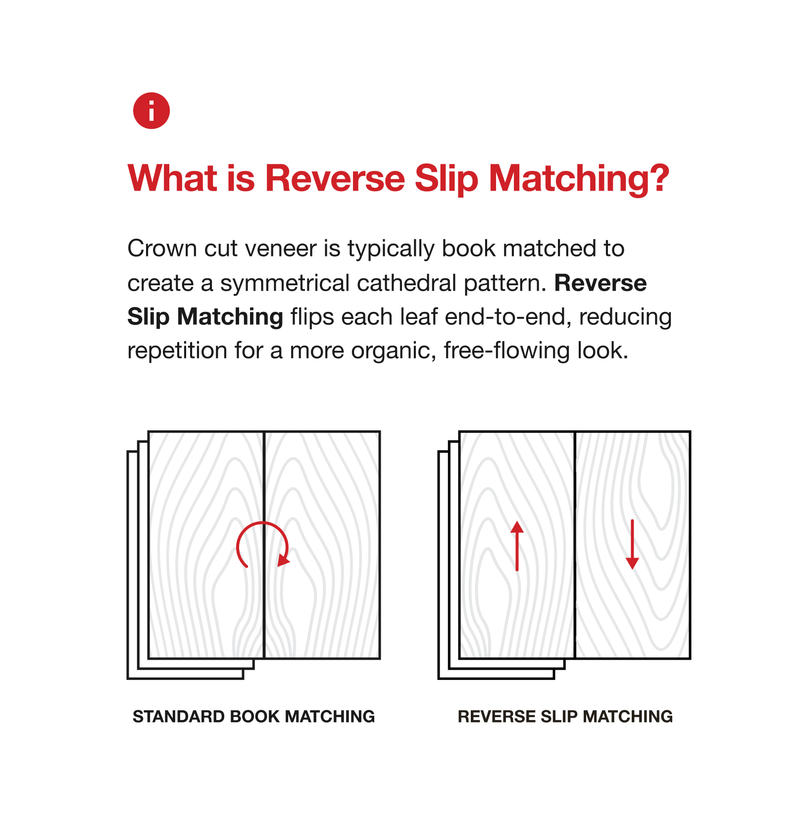 Grain Orientation: Reverse Slip Match + Cross Grain - Crown cut veneer leaves are flipped end-to-end (reverse slip matched) and laid with the grain running horizontally (cross grain) across the width of the sheet. Learn more about veneer matching