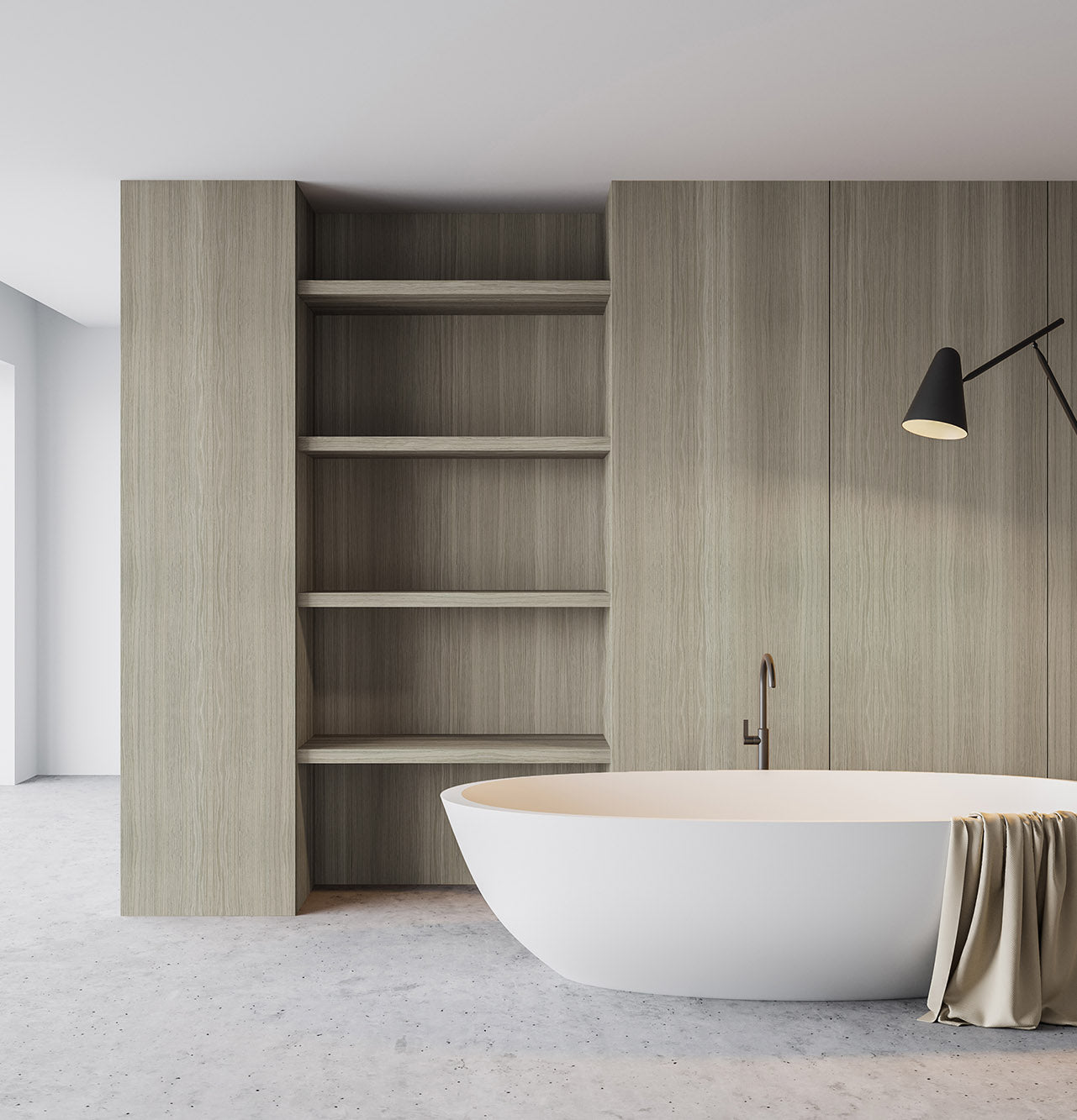 Bleached Oak is available pressed onto a variety of substrates including Plywood, Raw MDF, Moisture Resistant MDF and High Moisture Resistant Particle Board.