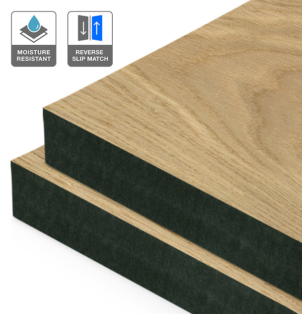 European Oak Veneer Crown Cut Reverse Slip Match on Black Moisture Resistant MDF