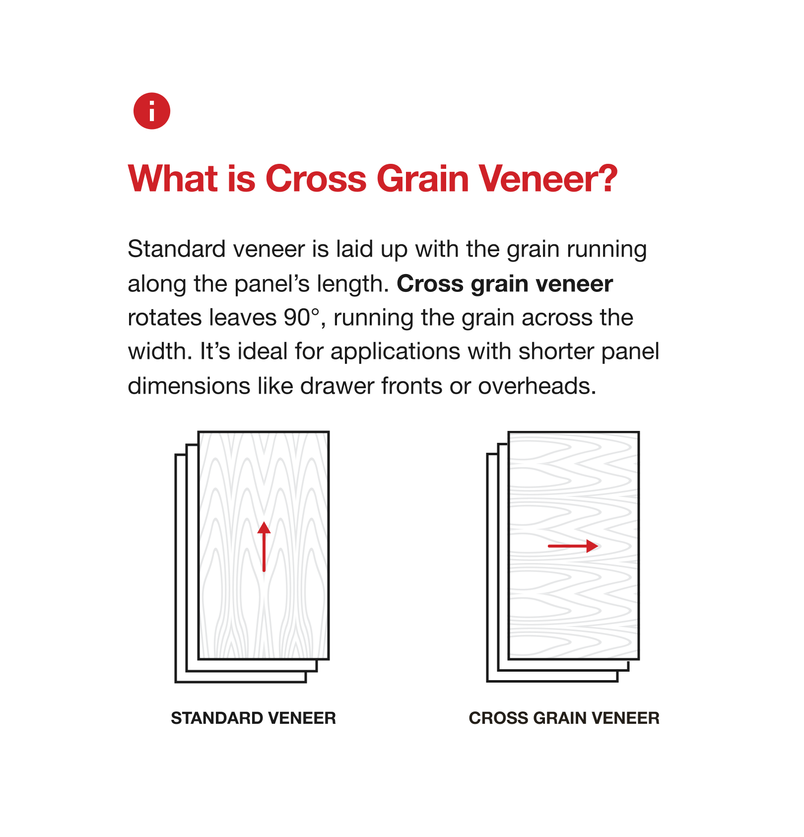 Grain Orientation: Cross Grain - Veneer is applied with the grain running horizontally across the width of the sheet. This configuration is ideal for drawer fronts, overhead cabinetry, and short-span applications.