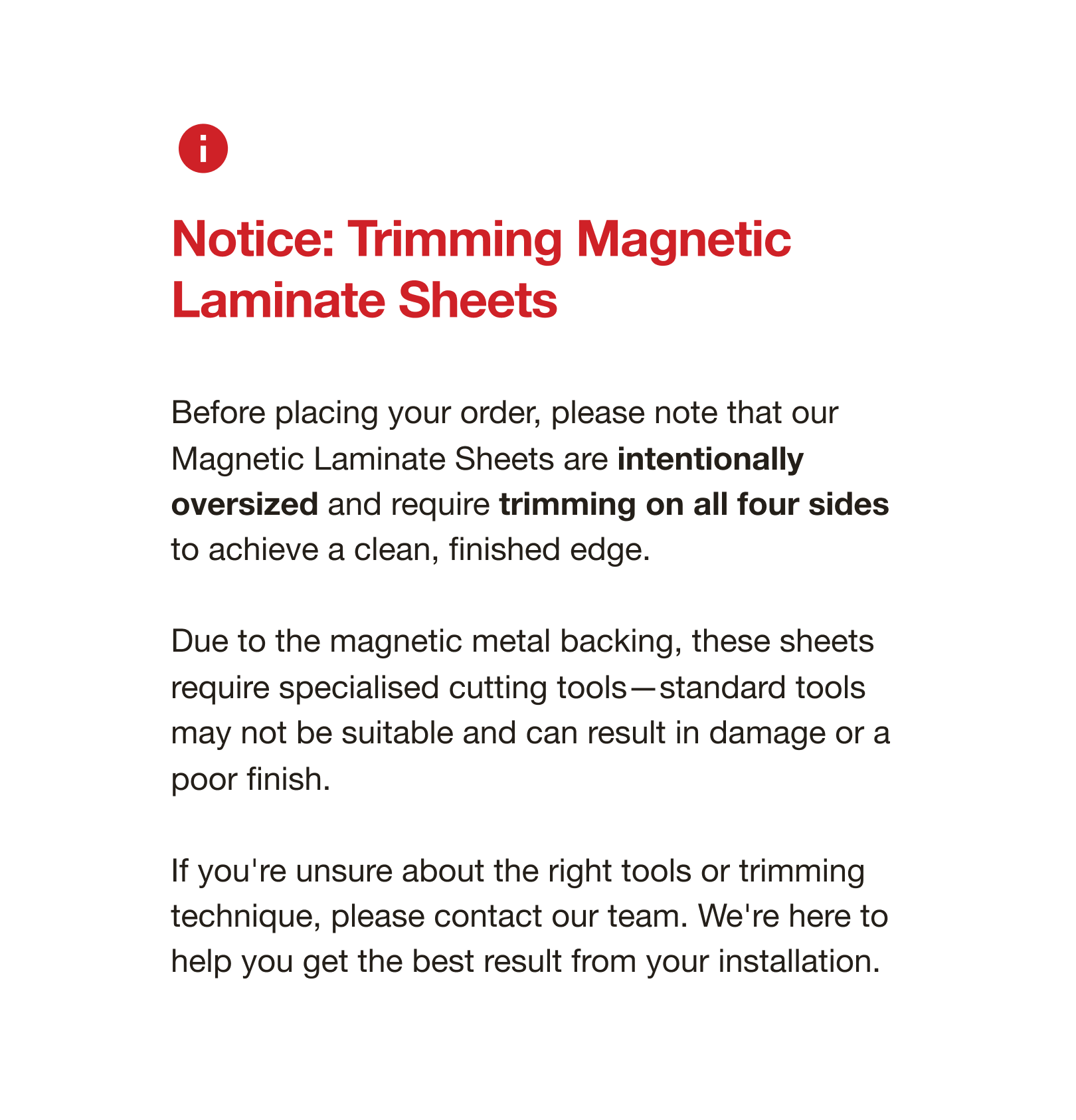 Important Notice: Our magnetic laminate sheets are supplied with untrimmed edges that require cutting and finishing before use. Due to the magnetic core, specialised tools are necessary for safe cutting and trimming, as standard woodworking tools may be inadequate. After trimming, edges must be finished for safety and aesthetics, such as by sanding or applying edge banding. Always use appropriate safety equipment when cutting, trimming, or finishing this magnetic material. For any questions or guidance, please contact our customer support team.